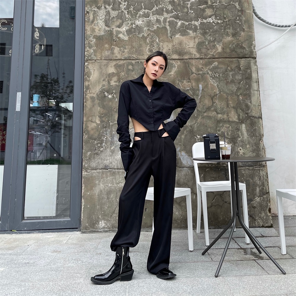 Aaakane黑色高腰超短款露腰长袖衬衫女设计感小众2022秋冬新款ins