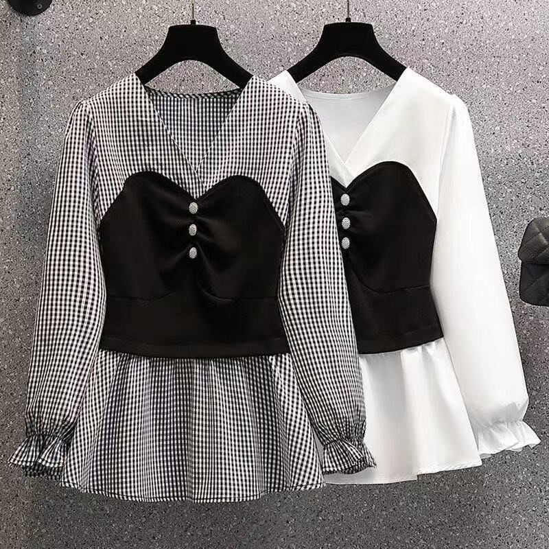 2021新款早秋胖妹妹显瘦格子长袖衬衫女气质小众设计感假两件上衣热门设计联盟服务商