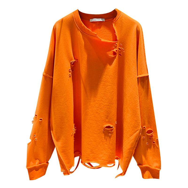 。韩版宽松圆领破洞卫衣女2021春秋薄款设计感小众中长款上衣秋装热门设计联盟服务商